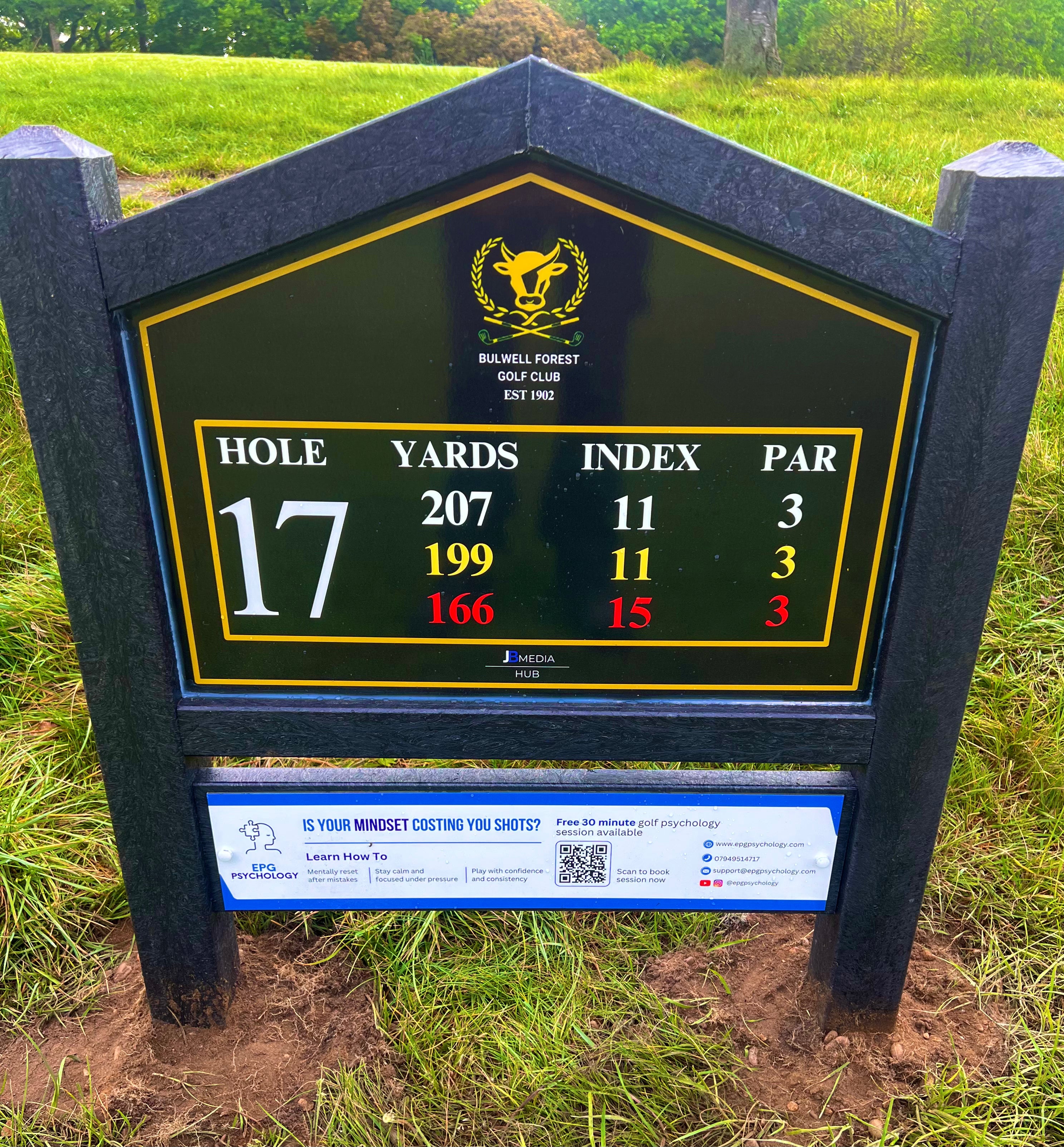 Year-round visibility for your business on a professional tee box sign seen by golfers every day.