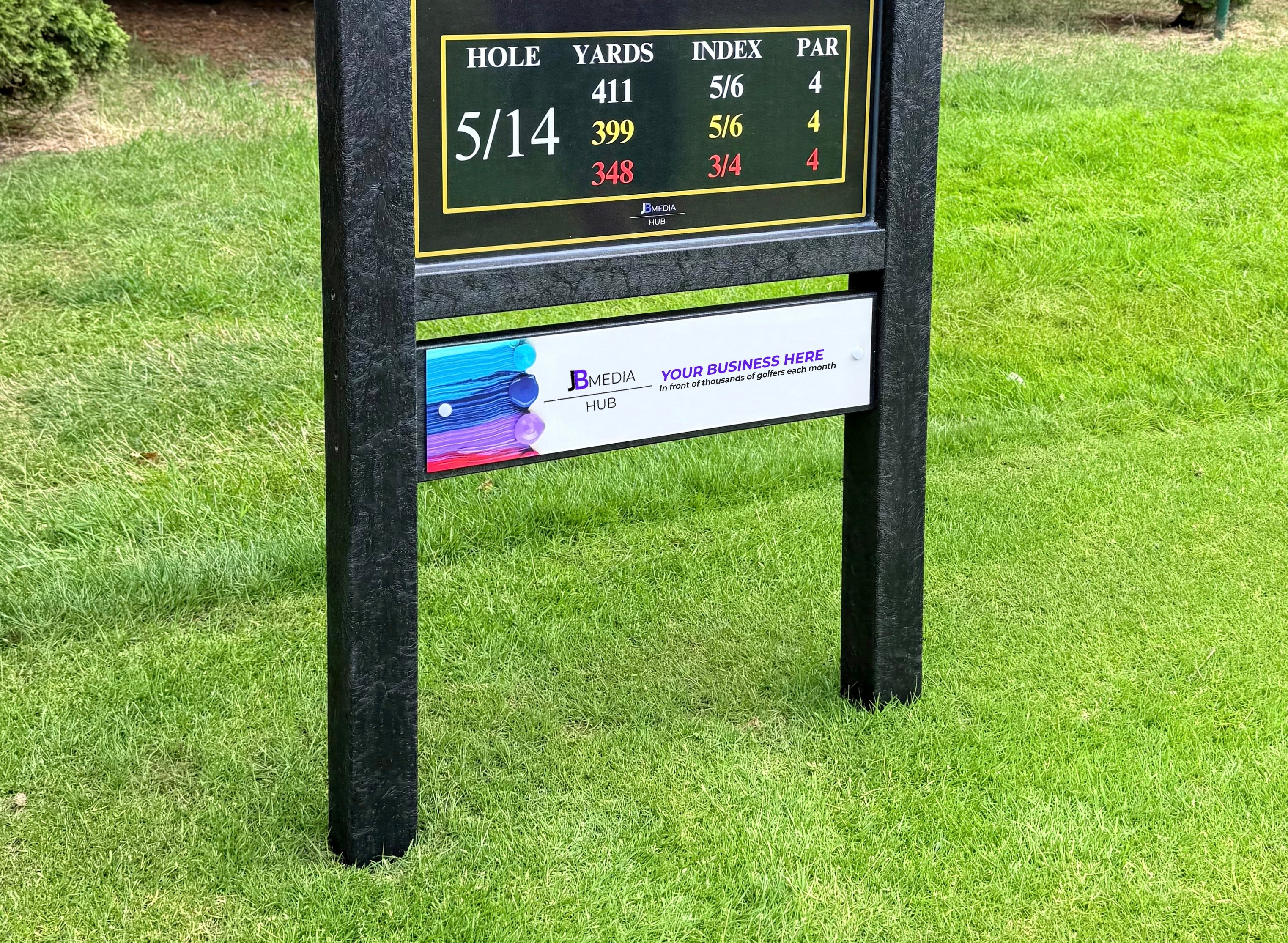 Year-round visibility for your business on a professional tee box sign seen by golfers every day.